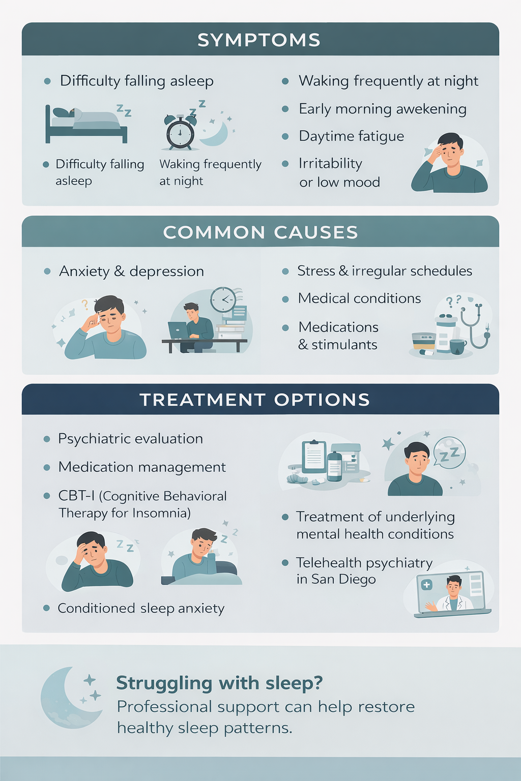Sacred Psychiatric Services provides comprehensive mental health care, including evaluation and treatment for insomnia disorder. Care is tailored to each individual and may include psychiatric assessment, medication management, and telehealth services throughout California.